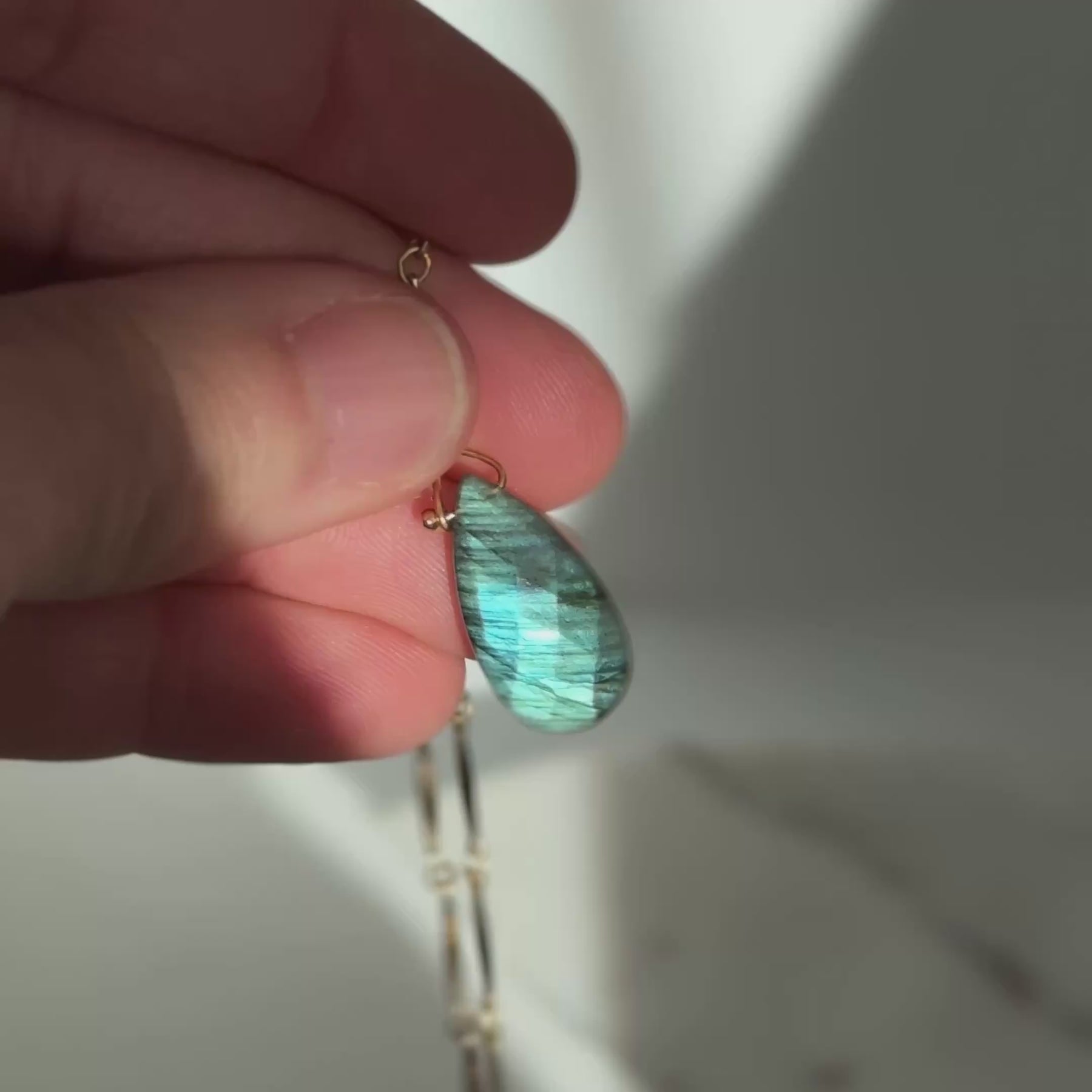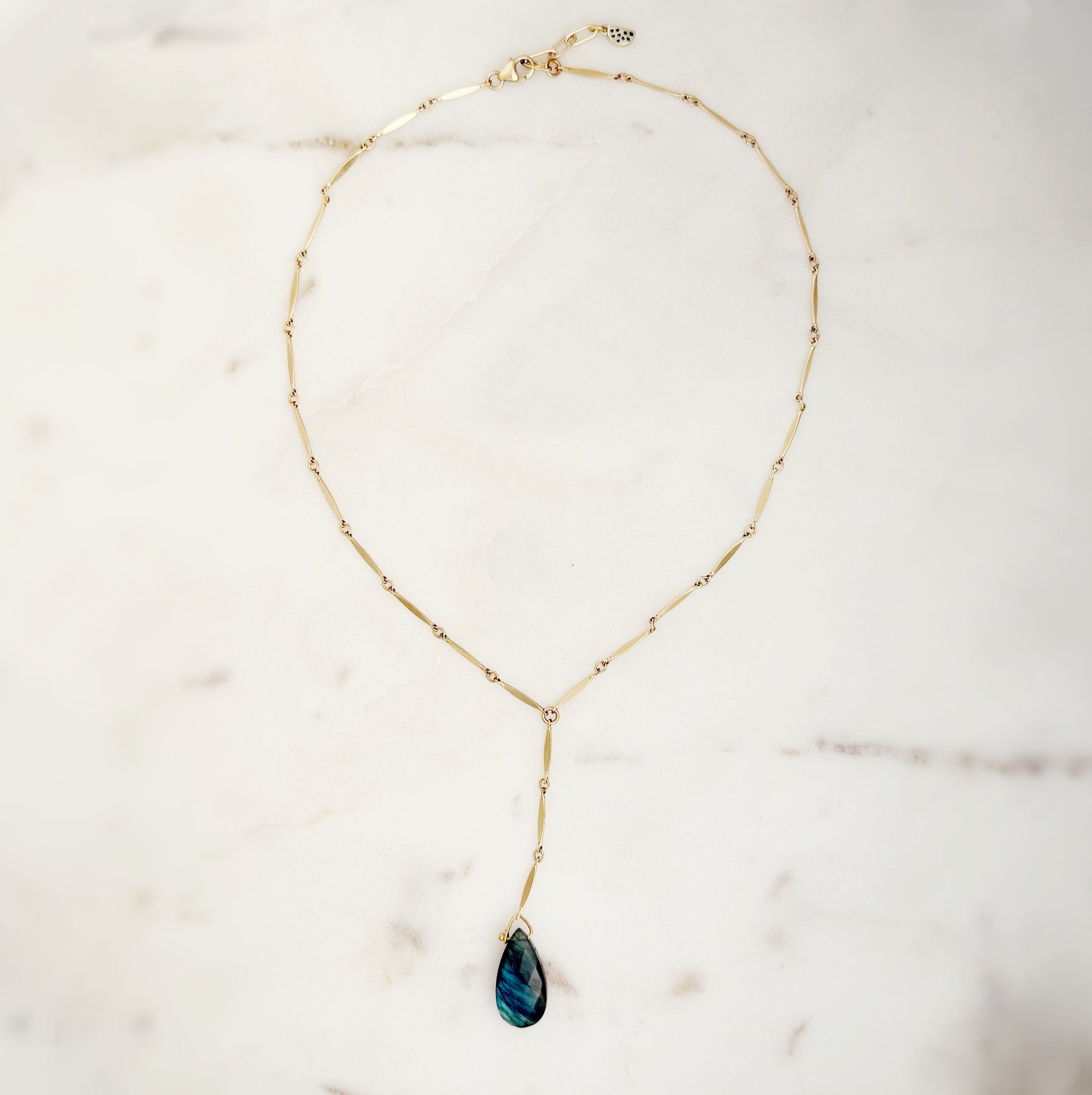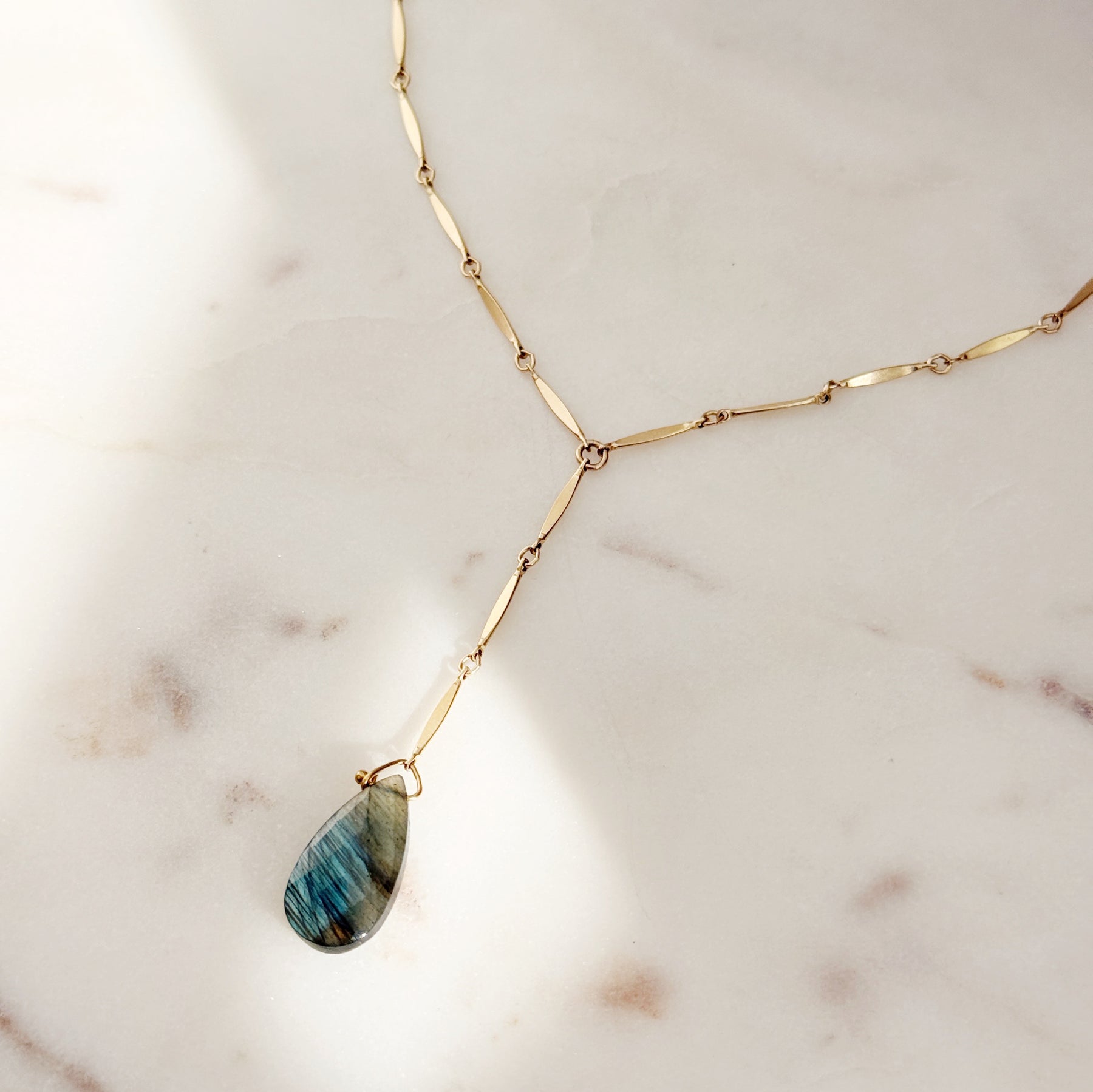 A quiet cascade of light, the Isla Moonfall Y-Necklace features a faceted labradorite stone that catches soft flashes of blues and grays with every movement. Designed to rest gently near the collarbone, this necklace offers a subtle statement and a gentle whisper of shimmer.