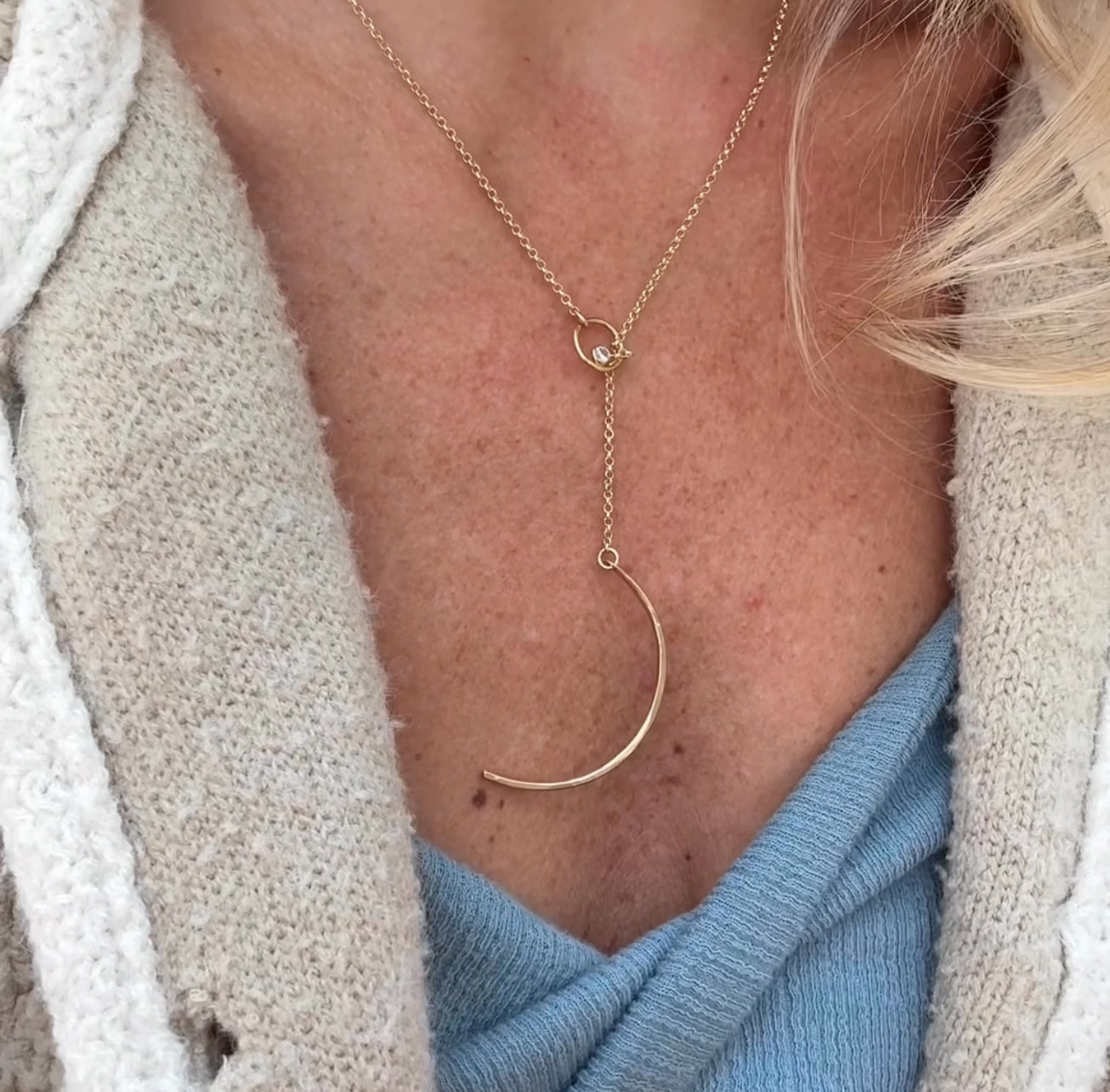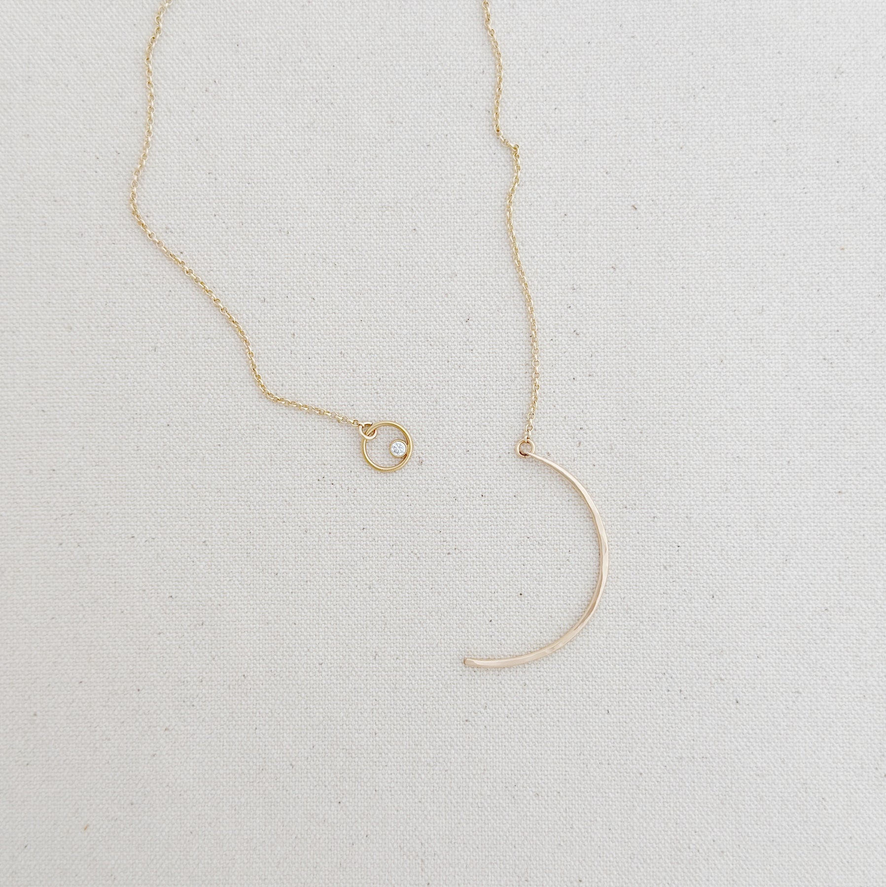 A timeless necklace for those who chase light, follow their own orbit, and never stop reaching higher. This hand-forged crescent moon is suspended on a clasp-free rollo chain and now features a delicate cubic zirconia as a sparkling reminder of the stars that guide us.